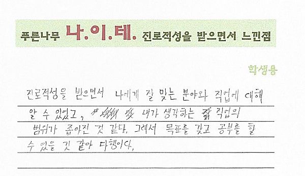 나이테 진로상담 후기(서울, 중2) 학생 페이지 정보 작성자 관리자 작성일20-02-26 14:03 조회4,668회 댓글0건 이전글 다음글 목록 본문 진로적성을 받으면서 나에게 잘 맞는 분야와 직업에 대해 알 수 있었고, 내가 생각하는 직업의 범위가 좁아진 것 같다. 그래서 목표를 갖고 공부를 할 수 있을 것 같아 다행이다. 댓글목록 등록된 댓글이 없습니다. 이전글 다음글 목록
