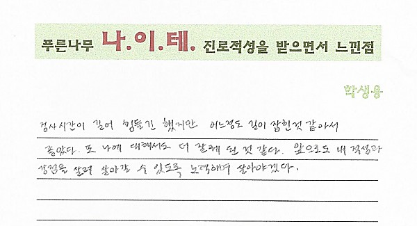 나이테 진로상담 후기(거제도, 고3) 학생 페이지 정보 작성자 관리자 작성일19-12-16 10:54 조회5,290회 댓글0건 이전글 다음글 목록 본문 검사시간이 길어 힘들긴 했지만 어느정도 길이 잡힌것 같아서 좋았다. 또 나에 대해서도 더 잘알게 된 것 같다. 앞으로도 내 적성과 강점을 살려 살아갈 수 있도록 노력하며 살아야겠다. 댓글목록 등록된 댓글이 없습니다. 이전글 다음글 목록