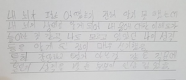 나이테 진로적성 후기 페이지 정보 작성자 관리자 작성일17-07-28 16:48 조회5,492회 댓글0건 이전글 다음글 목록 본문 내 뇌가 평소 어땠는지 전혀 알지 못했는데 내 뇌의 상태를 알게되어 내 몸에 대한 이해도가 늘어난 것 같고, 나도 모르고 있었던 나의 성격 등을 알게 된 점이 매우 신기했음. 특히 간단하고 별거 아닌 것 같은 질문에 본인의 성격을 맞춘 부분이 인상 깊었음. 댓글목록 등록된 댓글이 없습니다. 이전글 다음글 목록